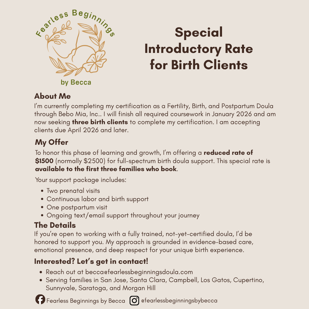 If you’re open to working with a warm, professional doula-in-training, I'm offering a reduced introductory rate for my first three Birth and Postpartum families. Reach out to connect!